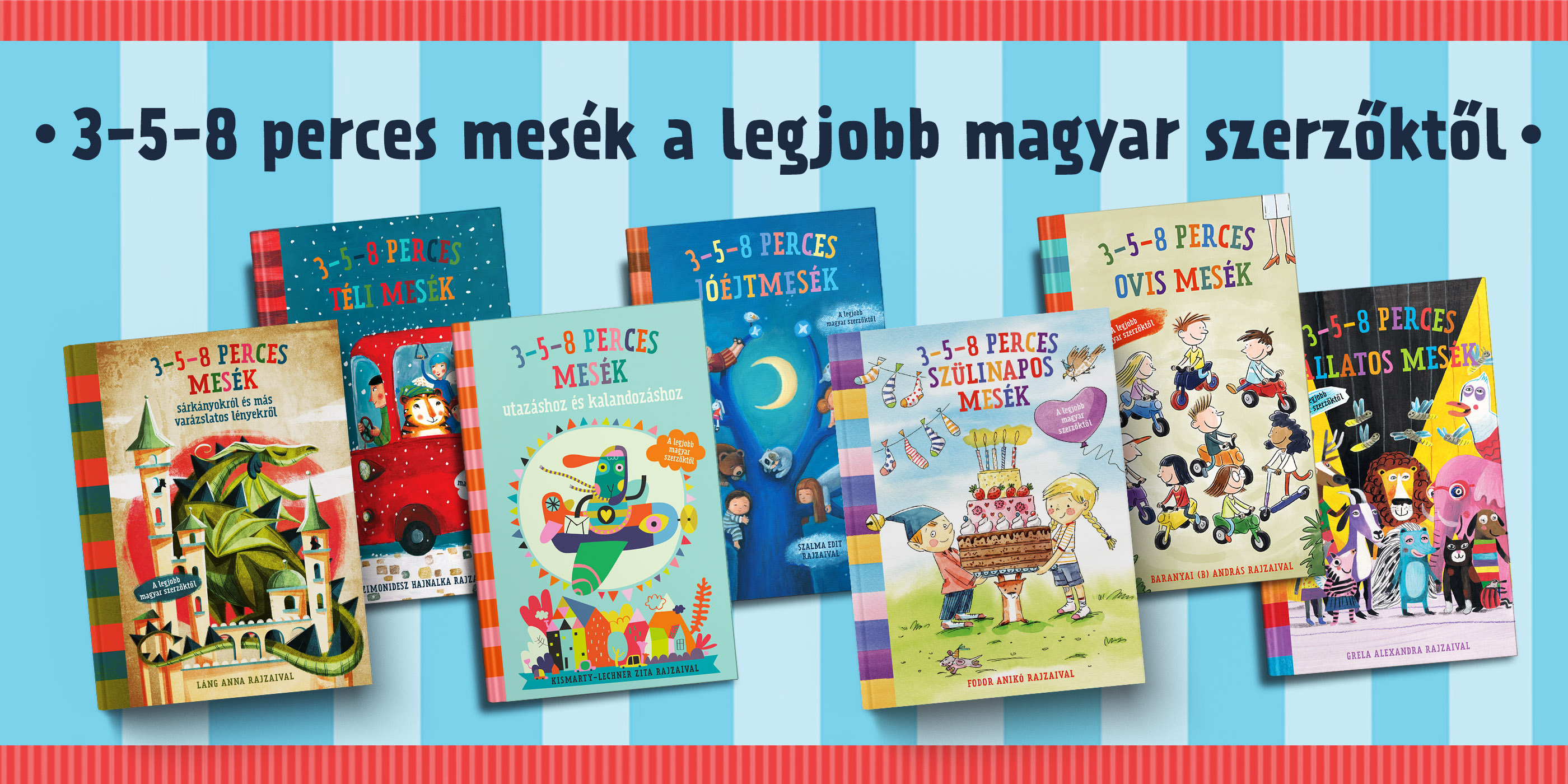 <description><p>Ismerd meg a legfrissebb könyveket! Könyvek, amiket mi ajánlunk neked!</p></description>Praktikus, sokszínű és minden alkalomra megfelelő meseválogatást keresel, amiben sok-sok mese van, hogy biztosan kitartson egy távoli nyaralás alkalmával vagy a hosszú, téli hónapokban? A 3-5-8 perces mesék-sorozatban biztosan találtok olyat, amiből minden este tud választani valami izgalmasat a gyereked. A sorozatban nagy örömünkre egyre több magyar meseválogatás is szerepel a legjobb kortárs szerzőktől. A fantasztikus szerzőgárda nem csak azt garantálja, hogy szuper, változatos meséket olvashattok minden kötetben, de arra is lehetőséget adnak ezek a kötetek, hogy egy könyvben ismerjétek meg a kortárs gyerekirodalom színe-javát. Ebben a cikkben összegyűjtöttük az összes magyar 3-5-8 perces kötetet. Ismerd meg őket mind!